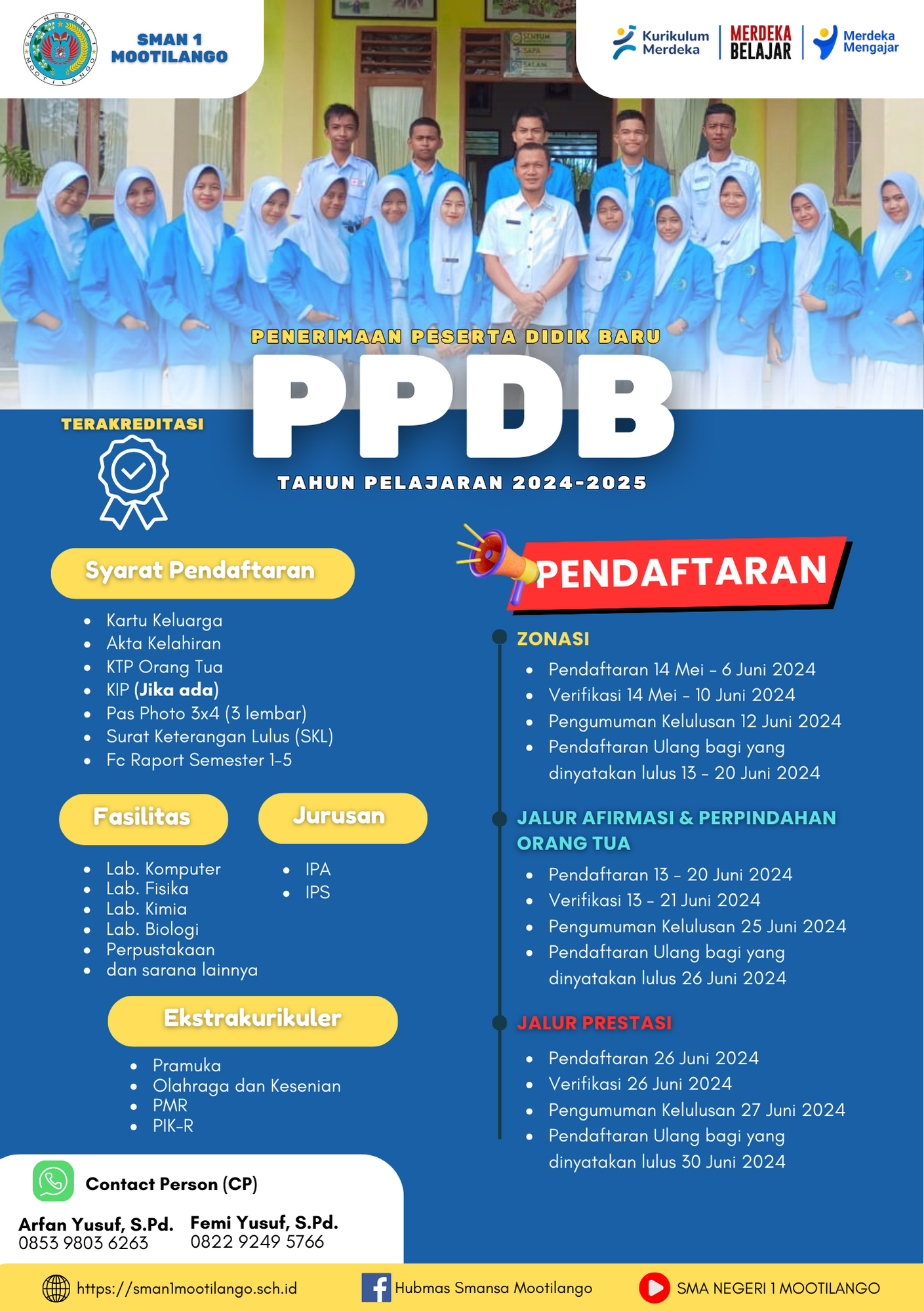 Bagi para calon siswa yang berminat untuk bergabung dengan SMA Negeri 1 Mootilango, jangan lewatkan kesempatan ini untuk menjadi bagian dari perjalanan pendidikan yang bermakna dan penuh prestasi. Informasi lebih lanjut mengenai proses penerimaan peserta didik baru dapat diperoleh melalui situs web resmi sekolah sman1mootilango.sch.id atau langsung menghubungi pihak sekolah.